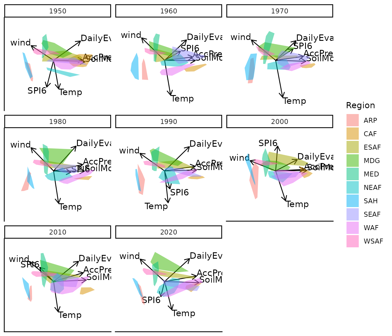 To illustrate the animated biplots, we use a climate dataset included in the package. This dataset, Africa_climate, contains climate measurements from 10 African regions over time: