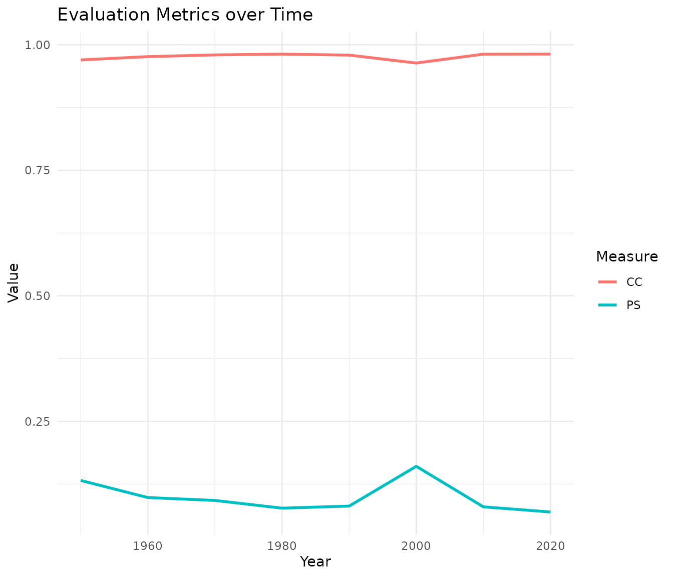 The line plot shows that the biplot of 2000 results in a lower CC and larger PS value compared to the other years. This means that there is a noticeable difference between the year 2000 and the average across years and the measurements of 2000 should be investigated in more detail to understand the cause of this difference.