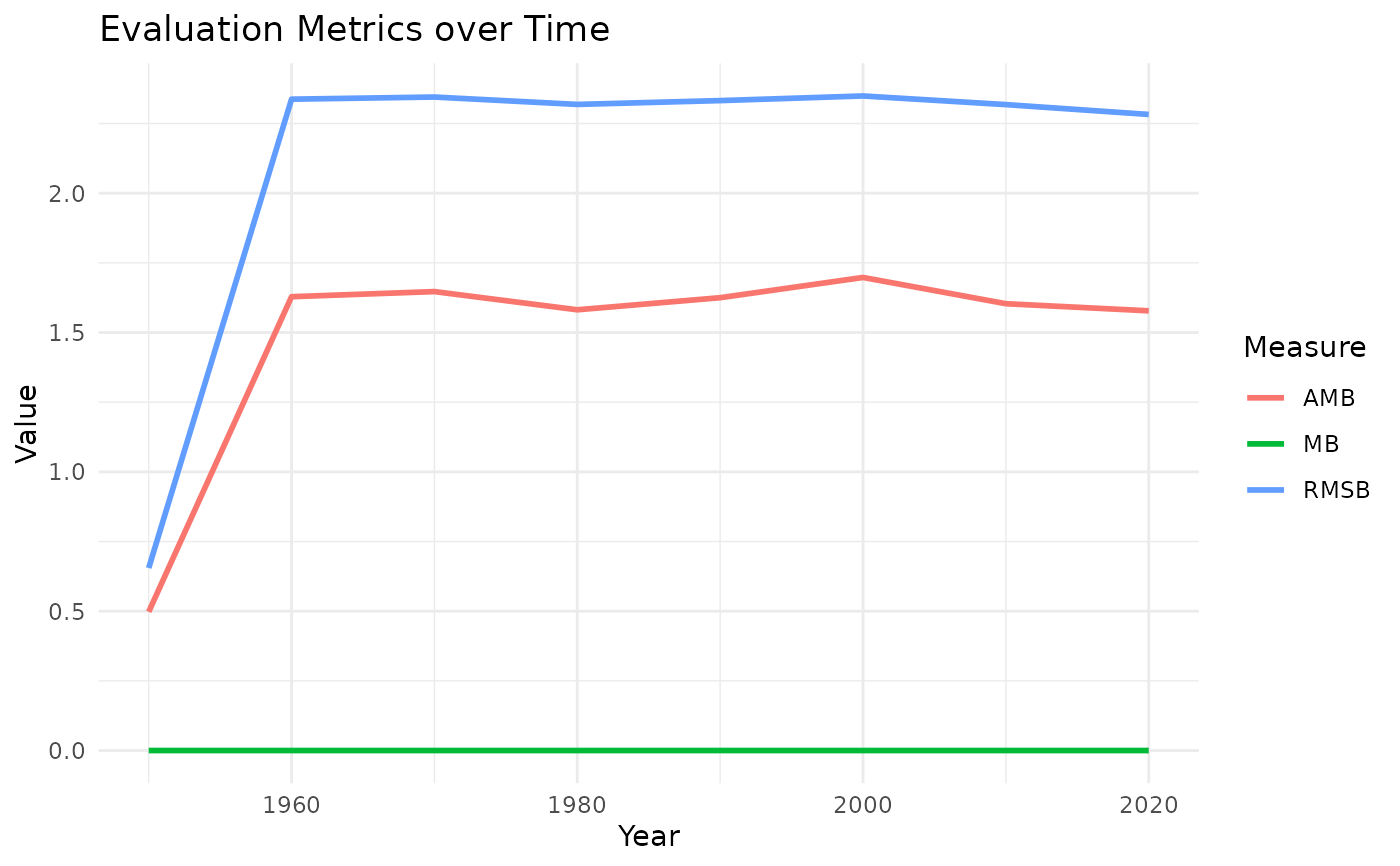 Returns a line plot with bias measures taht are unbounded: AMB, MB and RMSB. Small values indicate low bias.